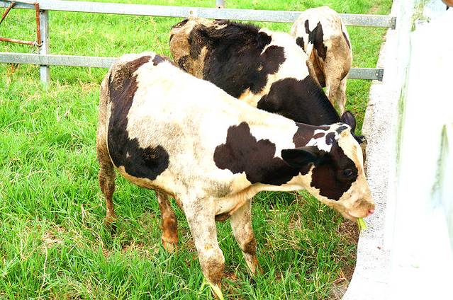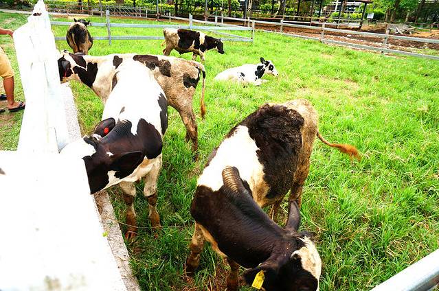 牧场围栏边有些比较贪嘴的奶牛,会等着游客购买对它们来说更美味的菜来喂,这和很多动物园里面的互动区一样,小朋友最喜欢了。