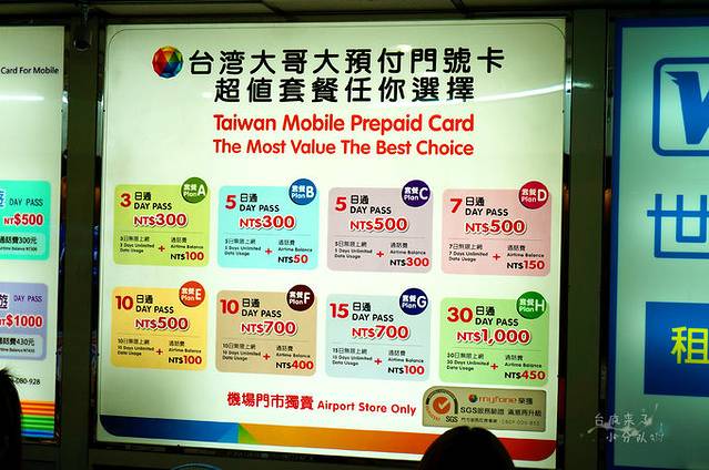 到机场一般都会办几件事——办电话卡、领青壮卡和拿攻略地图册。小册子在各种柜台上直接领就是,大多数不是很实用,但有些带地图的还是可以参考的。青壮卡最近已经不能在机场领取了,之前查攻略的时候就发现,很多朋友苦找都没找到。但是去高铁站和大型的捷运站都是可以办的,其实很方便哈,不需要一定要在机场。电话卡确实在机场办很方便。找到这样一排柜台,就可以看到各个公司的很多套餐了。