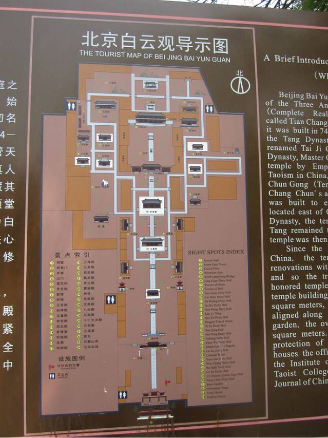 白云观保存的相当完整,整体建筑分中、东、西三路及后院,规模宏大且布局紧凑。中路以山门外的照壁为起点,依次有照壁、牌楼、华表、山门、窝风桥、灵官殿、钟鼓楼、三官殿、财神殿、玉皇殿、救苦殿、药王殿、老律堂、邱祖殿和三清四御殿。话不多说,先上游览图~