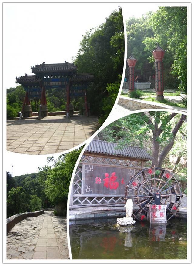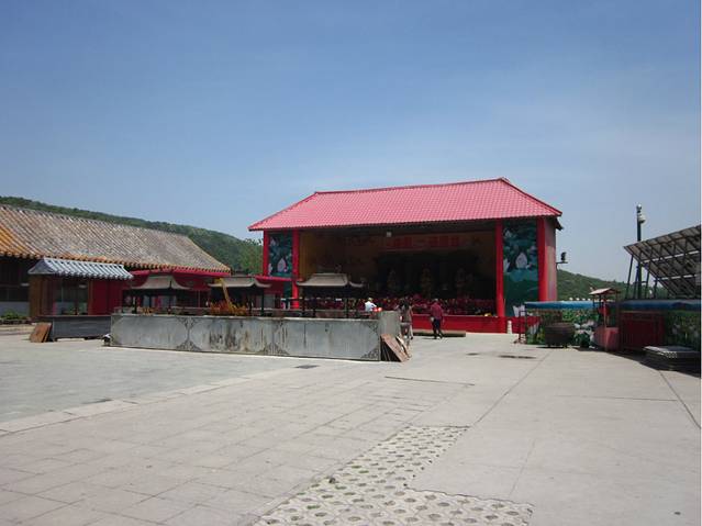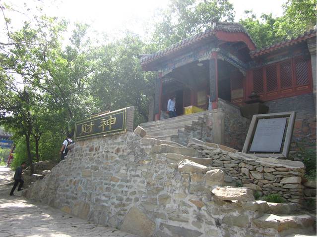 山路忽转处,一片疏林掩映着一座红墙灰瓦的卷棚顶古建筑,这便是“老爷庙,因高踞于山巅巨岩之上而显得高峻突出。该殿正中供奉关圣帝君坐像。关云长红颜长髯,金甲绿袍,威仪凛凛;周仓牵赤兔马在左;关平捉青龙偃月刀在右,十分威猛。