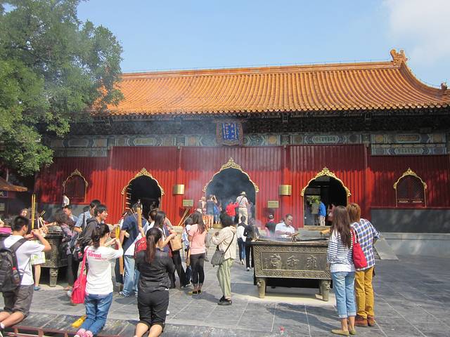 雍和宫可以说是京城里香火最盛的寺庙,雍和宫的香火之鼎盛你一下地铁就可以感受到。出了地铁,你不需要跟路人多打听,跟着络绎不绝的香客和一字排开的卖香小贩的队伍,你就可以走到大门口。
