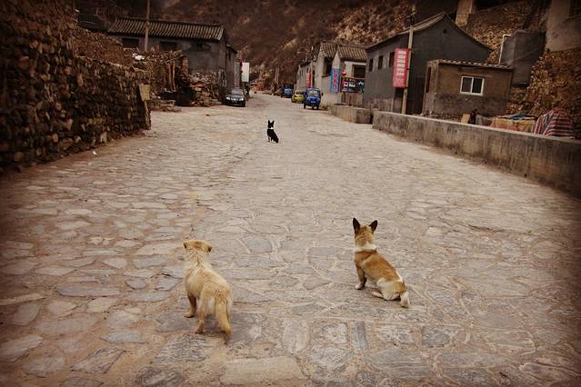 还有这三只可爱的小家伙,一路护送我们到村口。就在我们上车准备离开的时候,我看到这三只可爱的小家伙竟然神同步般的蹲坐在村口,遥望村子,于是我拍下了这张照片。