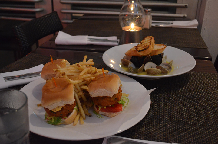 回去停好车发现还是miami beach靠谱哈哈全是游客所以灯火通明,11点1点了饭店还是各种热闹,正好不舒服,所以随便找了一家看起来不错的就进去了!结果!明智的选择,我点了一个什么crab cake什么,4个小的,很好吃啊~BF点了一个什么牛排加薯条,很赞哦!吃完就奔回去睡觉了~累死了哦不过超开心,最终还是看上了miami的城市夜景,要一直下雨就麻烦了