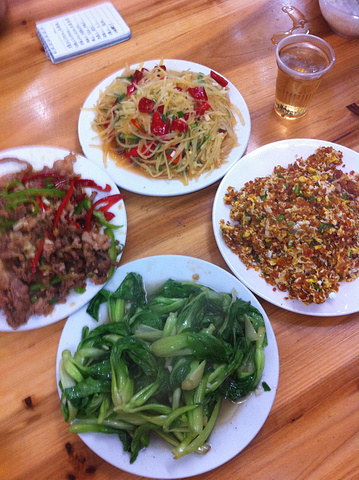 酸辣土豆丝,青椒肉丝,素炒白菜,玉米炒鸡蛋。