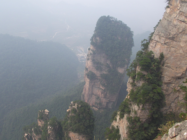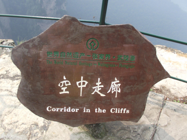 从一步登天下来,从小卖部的右边下山,下到平台,有一块指示牌。记住:千万不要在往下走了,哪里标明灵石咬树,但实际没什么看的。从右边沿着山壁向上爬大约10分钟就到了空中走廊。来自游记张家界、天门山背包游详尽攻略(极其详细)