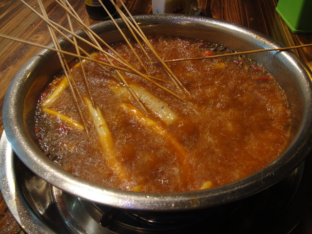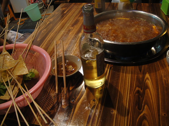 洪崖洞往朝天门方向走,肚子饿了,看到路边小店有串串香,全是麻辣的,对我们来说是一大挑战啊。一串4毛钱,是不是超级便宜,汤底免费(如果要白锅就要几十元),油碟几块,哇,不得不赞下老板推荐的鸭肠和牛肚,很爽口,超好吃,吃了一会就辣到嘴巴肿了不得不停下。老板很汗我们居然如此不能吃辣。旁边几桌的拿了几十根串串,我们20根~~~老板是帅伙子+很热情
