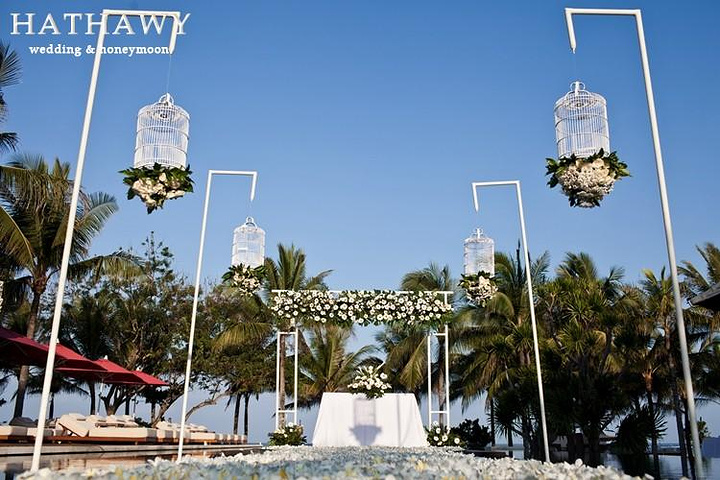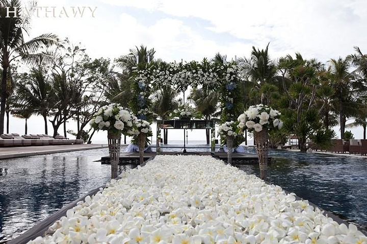 我们的婚礼现场。整个走道铺满了百合(因为百合的寓意“百年好合”,所以和老公商量之后,决定都用百合) 连两边的花束装饰也选的是百合,很大气有木有?!走道的两边是水,很喜欢这种花园的感觉。婚礼现场-走道婚礼走道铺的百合花来自游记我的巴厘岛花园主题婚礼