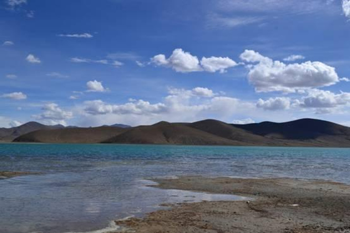 今天天气多云,但阳光还是从好几处地方透过,湖水呈现出静溢深秀的兰色,圆润如同镶嵌在群山间的玉带,湖边水较浅的地方,在阳光的照射下展现出兰绿变幻的色彩,让远处那弯本来就分外优美的湖岸,美得如同仙境。远远地看,水面平静,正如一个女神,静静地眺望着前方,思念着心中的那个人。而当你走近羊湖,波光粼粼,水浪拍岸,她并没有你想象中的那么恬静。你可以看到所有的蓝色,水很清澈,湖面的深度、湖中的植物、两岸的青山蓝天白云,所有的一切都让羊湖展现出一种让人难以想象的颜色,分分秒秒都在变,让人着了魔似的眨着眼睛、按下快门,想要记录下更多美。