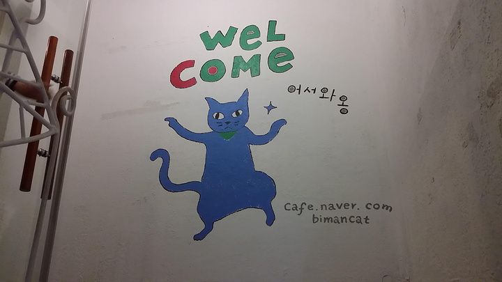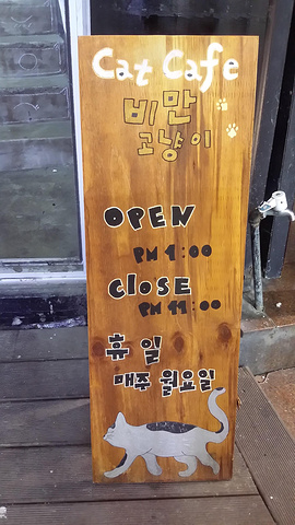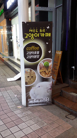 在七星路上逛吃逛吃我们俩也累了,就想找个可以坐着休息的地方。突然我们看到有个咖啡厅,在二楼。一楼入口的地方摆着一些有小猫咪图案的介绍,我们觉得很可爱,于是就上楼准备在这里休息一会。