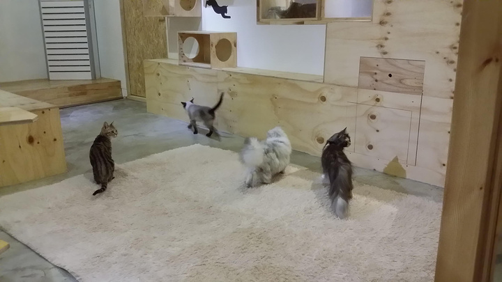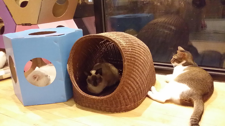 上了楼我们发现咖啡厅里面有好几只活蹦乱跳的小猫咪,竟然是活的,我以为这里也就是有一些可爱猫咪图案的东西或者别的小装饰什么的,没想到有活的小猫。好可爱!和小猫们玩了一会,休息了一会,我们从咖啡厅出来,恋恋不舍的告别的可爱的猫咪。