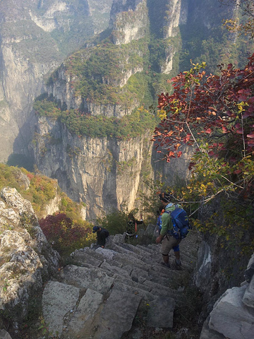 接下来是猫路。据说猫路近期也被新拓宽了一点,但就我看来,比前一天走的天梯要可怕的多。大部分台阶都是拿小石头拼起来的,坡度陡,而且路的前面就是悬崖。从上往下走的时候,我已经害怕的顾不得面子了,扒着墙头一点点的往下挪,下到一个平台上,远远的拍了一张照片就往回返了。队伍中,可能我是最明白猫路的来历了,因为只有我一个人,像猫一样扒着台阶,像猫一样弓着背向上,好不容易回到了队伍集合点,又是一身臭汗。