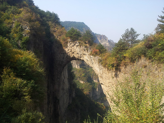 从侧面看天生桥的感觉跟走在上面是不同的,过了桥之后,我已经感觉到自己的脸色刷白,从侧面看,桥上的人只是一个小点,有过了身临其境的感觉,觉得这点困难还算是可以克服的。但是等我拍完照片,要从天生桥回去的时候,那种对高度的畏惧又来了。好在回去的路上坡比较多,我开始什么都不想,冲过天生桥,然后拽着树枝和石头,一路往回冲,直到过了松树林,才觉得安全多了,然后找个树荫歇歇脚,回去把午餐吃了。