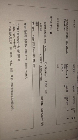 她说两种选择,一个人500RMB的快捷酒店,我们一家4个就2000,要么一人1500RMB的香格里拉酒店,我们一家4个6000,我傻啊,选了后者,附照片上有合同,大家看照片吧,我以为的盛贸酒店如图,百度可以自己搜到,后来合同写的盛茂我也没在意,以为音译是一个意思,结果我们花6000RMB一晚住的就是这个所谓最好的4星级酒店!打电话给胡丹丹客服给出的解释是这个酒店是香格里拉集团旗下的酒店,后来直接以下班为由再也联系不上了,人生地不熟只能在楼下小贩的嘈杂声和一家人的闷闷不乐中熬过了第一天!