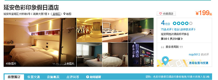 我是住在色彩印象这家酒店~基本每次去延安住的都是这家酒店~因为在市区~酒店下面就有吃de ~距离中心街就是5分钟路程~很方便