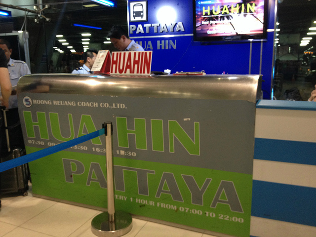 我们两个大人两个孩子乘坐飞机到达曼谷国际机场,飞机上填好出入境卡,下飞机就去找办理泰国落地签,落地签需要文件有:签证申请表,护照、2寸照片一张、回程机票、登机牌、1000泰铢鉴证费、旅费个人10000泰铢,家庭20000泰铢;落地签窗口排队人多,我们突然发现左边英文写着快速通道,中文写着团队,上去一问才发现一人多交200泰铢,上面要求的东西基本没查,几分钟就通关了。过了泰国移民局,我们就按屏幕提示去行李转盘那里取托运的行李。然后去到机场一楼8号门,有直达华欣的大巴,价格是305铢一人,发车时间是:早7:30、9:30、11:30、午13:30、16:30;晚19:30;大巴位子很舒适,共24个座位,如果担心没有座,就提前上www.belltravelservice.com 用信用卡订好位子。三个小时以后我们抵达休闲海滨胜地-华欣。提示:1 带件外套随时备着,大巴上的空调较冷,而且关不掉。2 如果没能赶上大巴,就要到机场负一楼乘轻轨到胜利纪念碑(Victory Monument)2号出口坐中巴,180泰铢一人,一两个小时发一次车,人满就走;3 也可以去到一楼6号门出租车柜台租车去:CRV车型2000泰铢单边,轿车型1800泰铢单边。 4 如果有时间就到机场二楼(Truemove) 299泰铢买张当地3G电话卡,方便查微信、网络、打电话。5 机场一楼最左边有泰国当地特色小吃,在中间的一家泰国米线卷粉很好吃,远一点儿的海南鸡饭也不错,如果时间够上机场三楼各式餐厅消费也不错。