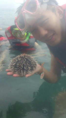 抓到一只海胆!刺在动证明它自己还活着……