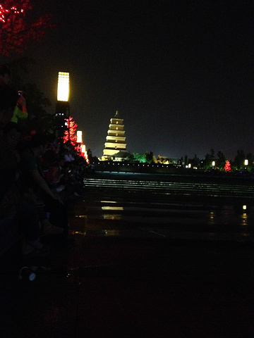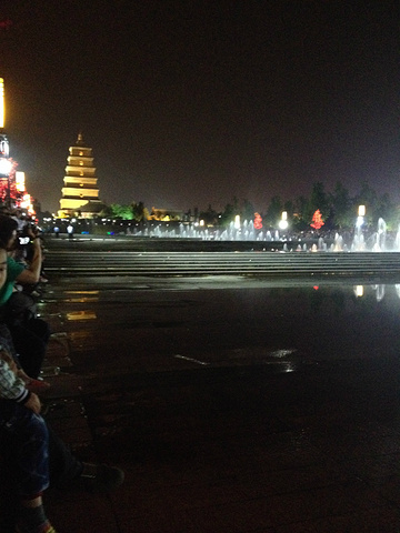 我们坐在喷泉边上等着看,不远处就是大雁塔
