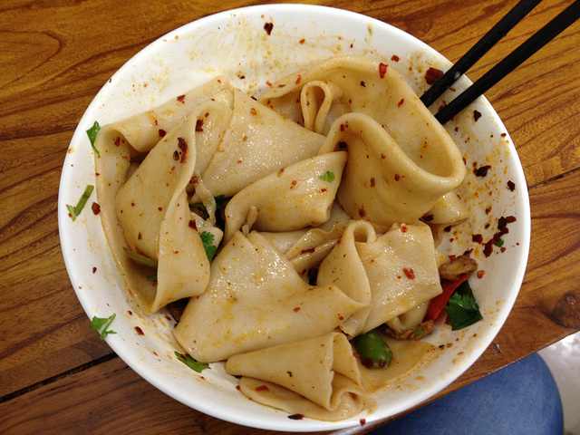 biangbiang面,打不出来这个字。很宽一条,还不错,也是有点贵。回来之后有同学说,这不裤带面么!我肿么知道,应该不是端错,可能是长得很像吧。没有拍很多照片,但是吃了很多很多,【贾家灌汤包】很好吃,16一笼,调料很赞。还有扎小土豆,凉皮,肉夹馍,石榴汁,哦天哪,回民街怎么这么短!