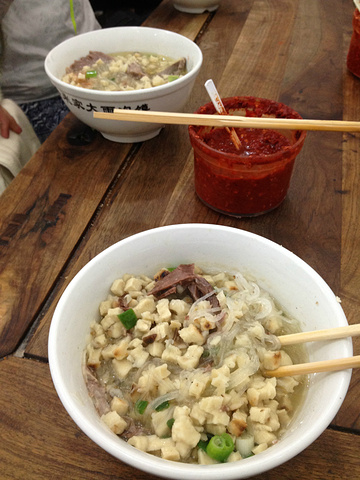 从大明宫做坐公交回住处,放下行李就去回民街了。昨晚,今天早上,都没有吃东西!!学生的天性是什么?找吃的啊!哪里是什么逛商场买奢侈品!【老米家大雨羊肉泡馍总店】没记错应该就是这个名字,在回民街里一个叫【西羊市】的小巷里,人超多,请脑补。一碗58还是38,忘记了,馍是切好的,当地人去吃会尽心尽力亲手掰,游客们都不得技巧所以还是吃现成。生意太好,需要自己端,看了一下厨房卫生有点不讲究,但是……怎么说呢,还是很好吃的。在西安也就吃了这一次,所以贵一点也能接受,更何况,这是面向广大游客的回民街呢。还有人配【冰峰汽水】,我没有,从小不爱喝,大家想体验可以尝尝啊。对了,记得放那个辣酱超好吃!