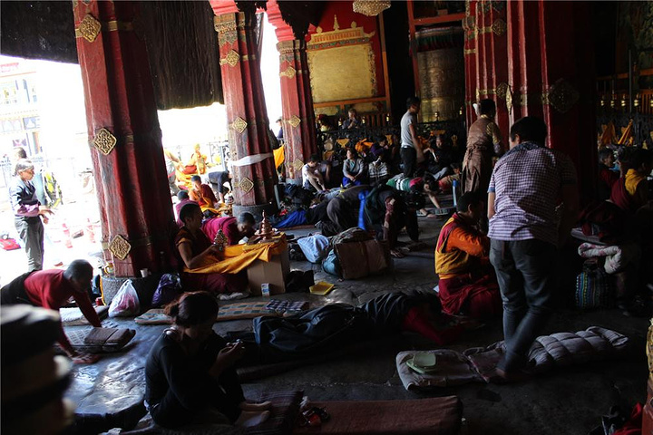 话说来到大昭寺,果然和扎基寺不是在一个档次。我们聘请了一位当地导游,操一口古怪的普通话,为我们解说。大昭寺的典故,沿途已经听得太多,但都是散碎的小故事,没有形成系统,经过从头到尾的走过一遍,说实话,依然还是糊涂的,教派多,神佛多,名字又难记,看了释迦摩尼十二岁等身像,看了牙柱,到此一游,也算了却遗憾。