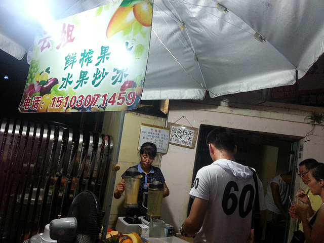 下午窝在公寓休息,在去哪儿网团购了158元的海鲜套餐,晚上继续步行去友谊路吃海鲜。网上搜罗附近美食发现了网评满分的云姐炒冰,就在下岗职工海鲜加工场外面,云姐很热情,要了一份木瓜牛奶炒冰,新鲜水果现做的冰淇淋真的好吃。团购的海鲜套餐内容还是很丰富的,老板娘现去买的新鲜货,只是大小还是有差别,味道还可以,总之158元还是超值的。