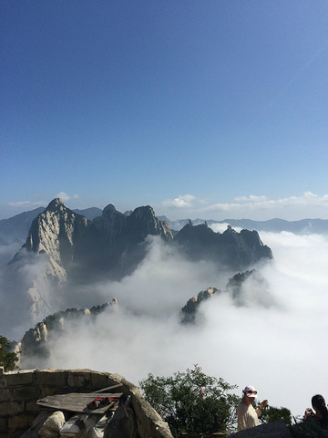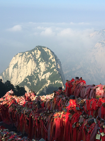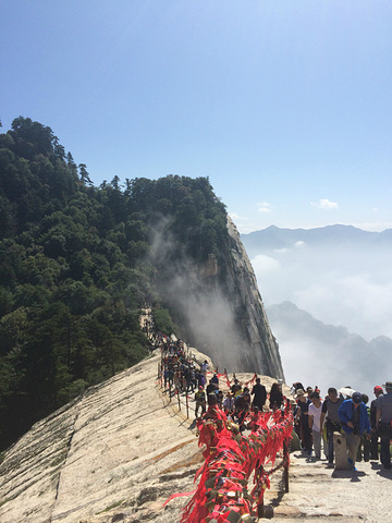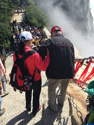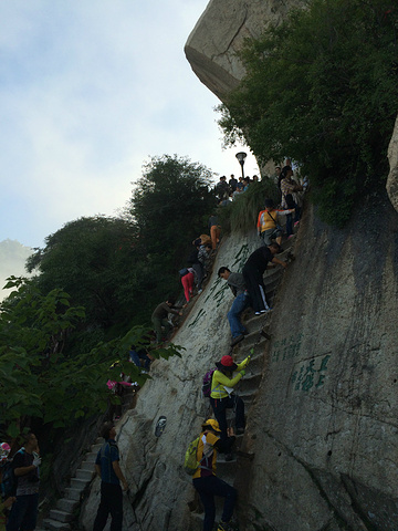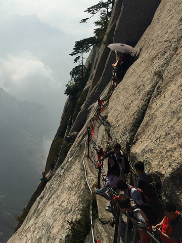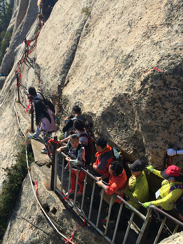 华山的著名景点.说一下装备,除了一双好鞋,吃饱穿暖外加带水外,还需备一副手套,因为北峰有一段比较艰险的路程,需要抓旁边的铁索才能下.