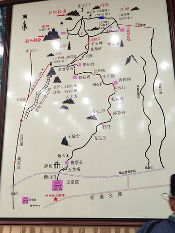 华山全景图.我们早上6点起从南门搭公交到火车站,然后坐上去华山的旅游车.全程2个多小时.(要说的是我们原本做的攻略是到火车站坐游1到华山的,结果前一天在到兵马俑的车上售票员跟我们说游1已经停开了,要我们去找到华山的旅游专线,所以当天们从兵马俑回到火车站就特地去找了到华山的旅游车,单程36,可以一次买往返的就60.早上6点开始发车,一天有20多趟,下午最晚5点半返程.因此不像网上说的1天只有一趟7点发的)