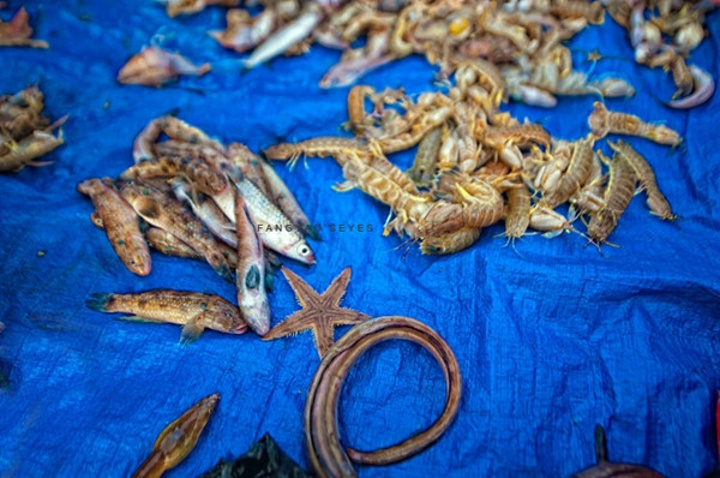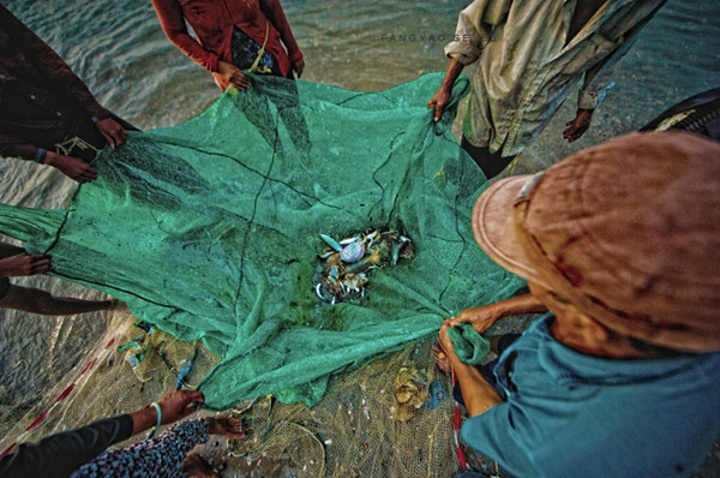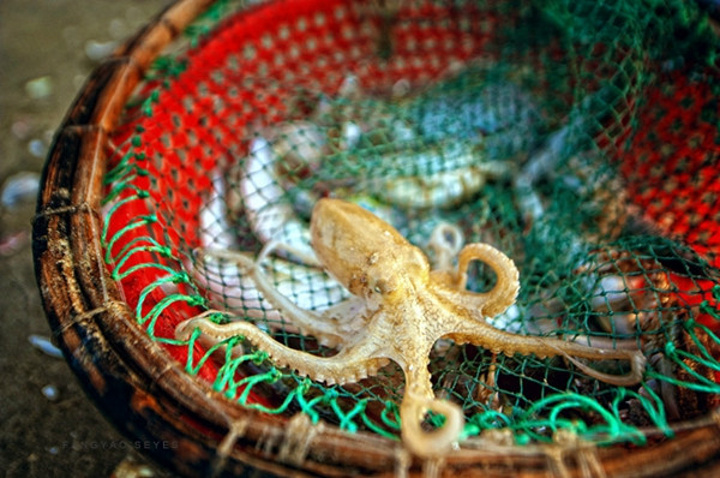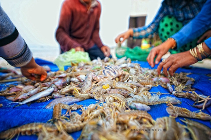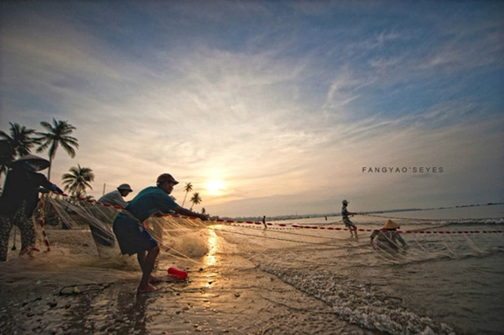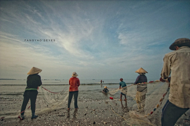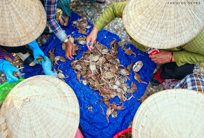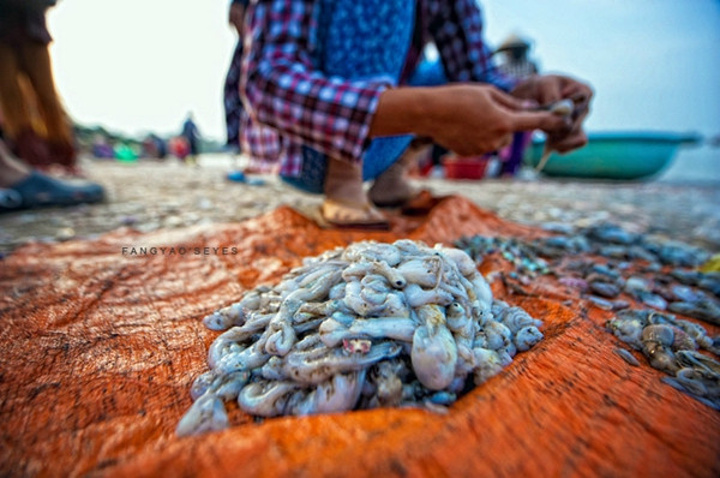 我们走下渔村海滩时,正有不少当地的渔民在收网,还没见过这场景的我们立即被吸引过去。10个渔民正用双手一点点将海中的渔网拉上海滩,当渔网被拖上岸的时候我本以为会是次大丰收,而网中那数得过来的小鱼小虾却让我大失所望。不远处的交易集市早已热火朝天,我们也走入这海滩集市,体会这原汁原味的越南渔村早市生活。