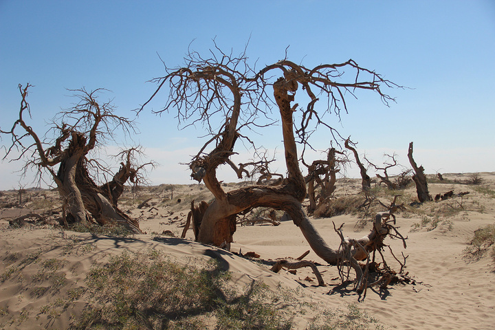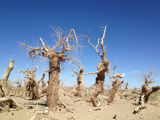 【关于怪树林】苍凉的“怪树林”,据说是黑将军及众将士不死的灵魂所在。黑将军带领士卒冲出城外后,一路拼杀,最后战死在离城西不远的怪树林。实际上,怪树林是枯死的胡杨。