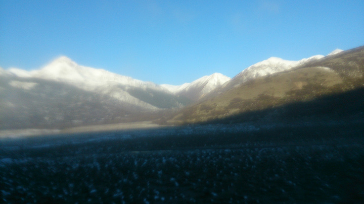 在车上用手机拍的雪山都如此美丽,蓝天与白雪。