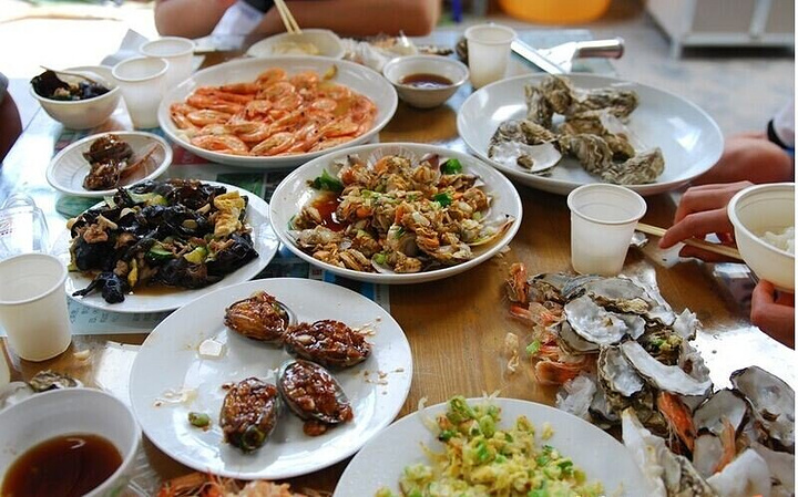 这是我们第一天吃的第一餐中午饭。这么一大桌,4个海鲜,2个家常菜。一共才210元。一共3个大人,三个孩子吃的啊。最后虾剩好多,为了不浪费,我们又吃了好多虾。
