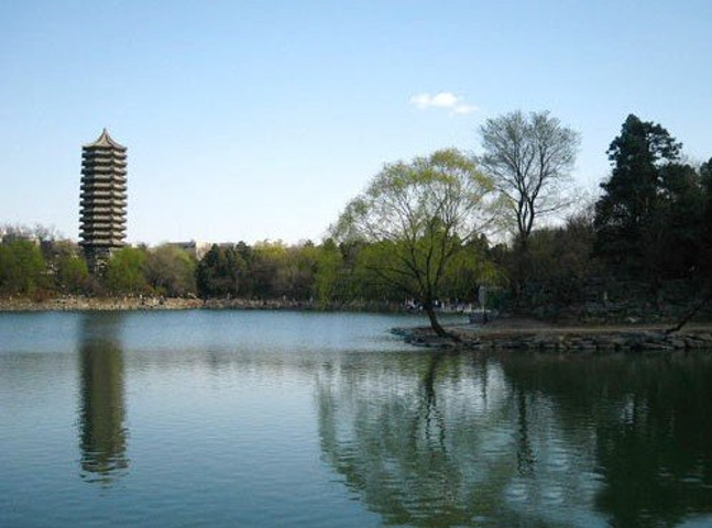 顺着塔一直往前走,就看到传说中的北大未名湖了,湖水清澈见底,蓝天白云交相辉映,景色美翻啦!