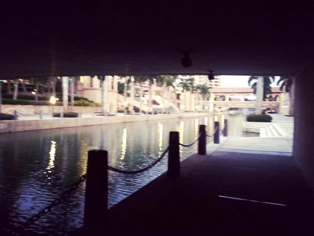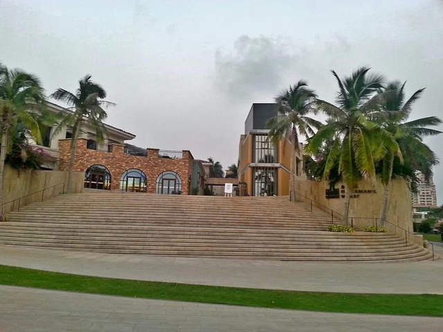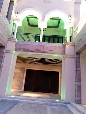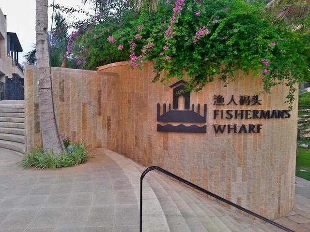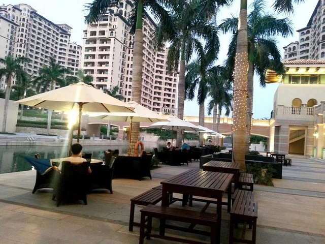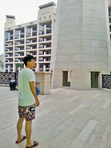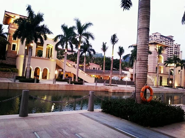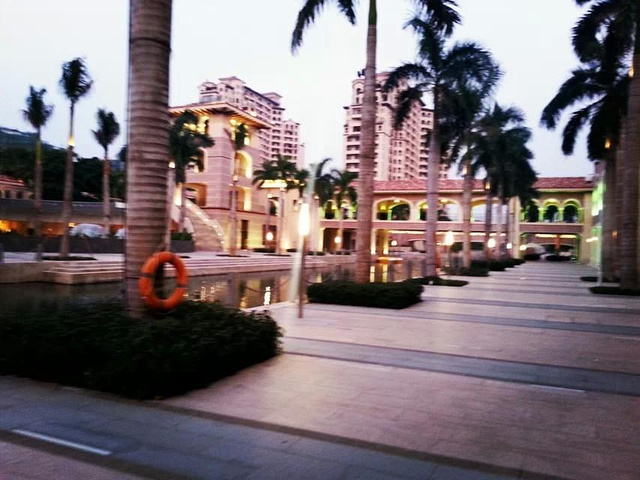 从私人沙滩到酒店的路。人工的长河,一旁有商业街。很美,像城堡。