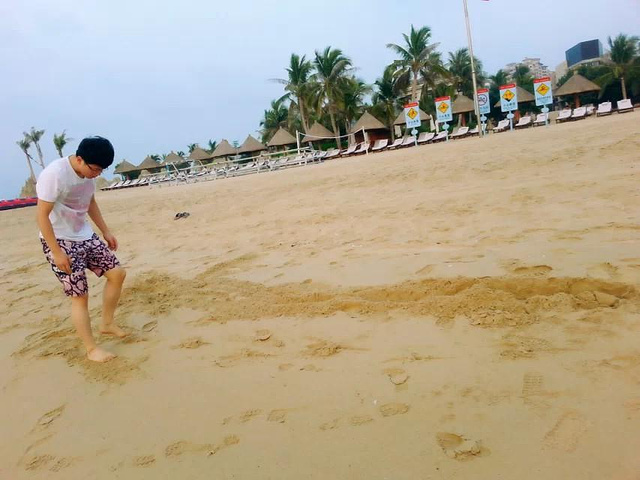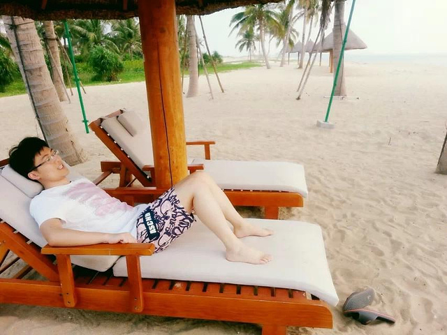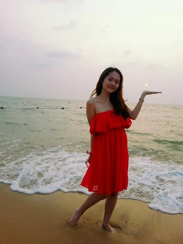 游泳又边泡澡边玩ipad看电影完,我们在最热的时间点午休了一会,到下午4:30的时候,起床准备去酒店私人沙滩看日落!这个龙沐湾据说是看日落的最佳观景地点。