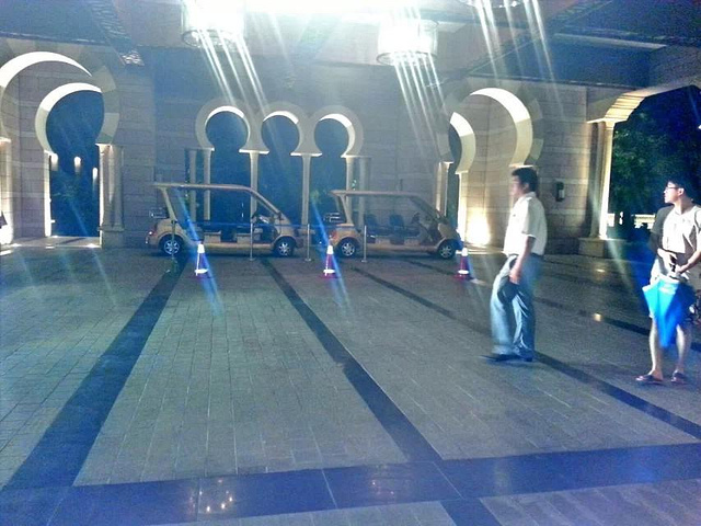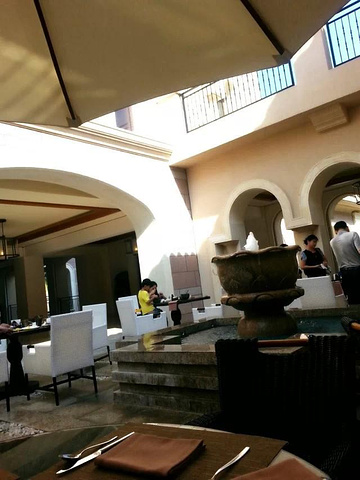 早上7:00出门。由于前一天两个人很早休息的缘故,第二天早上6:30就起床了哈。戴上遮阳帽和墨镜,叫酒店的观光车,很快就到了!其实走路从住的楼到餐厅也就五六分钟,这个是后来知道的。