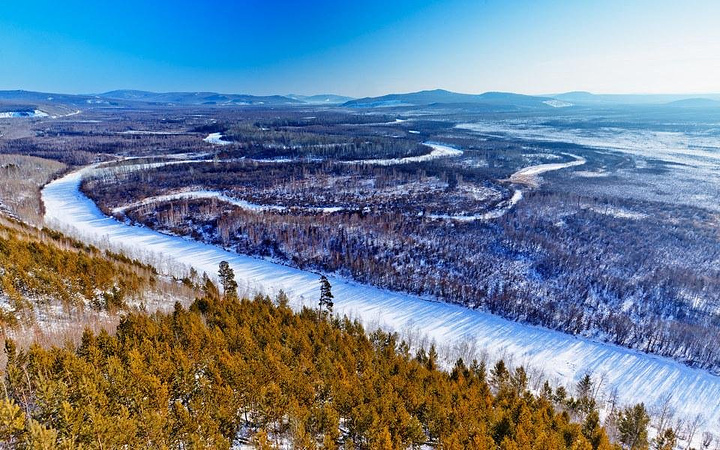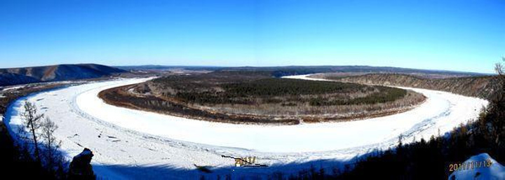 黑龙江第一湾也称“龙江第一湾”,是黑龙江水自源头沿着内外兴安岭交界处的低谷一路东流150公里后在漠河县境内的红旗岭段时,江水急转回流,形成一个完美的Ω形江湾,这个长达30公里的神奇江湾就是黑龙江第一湾。