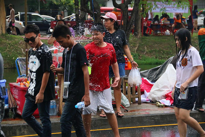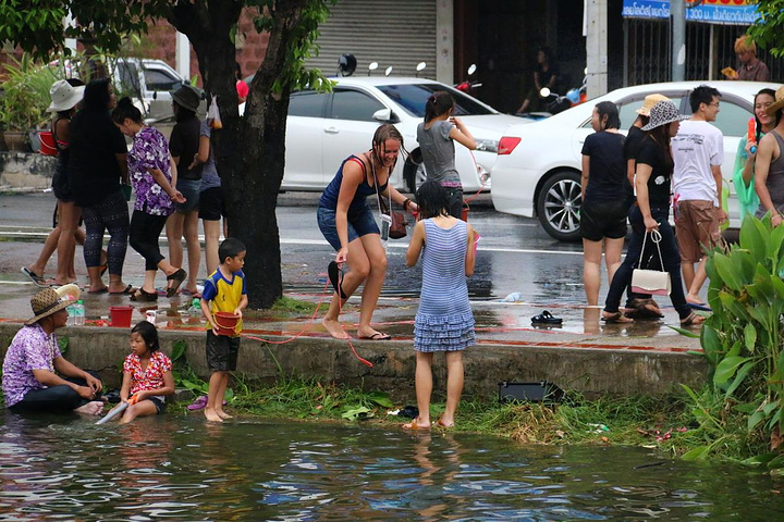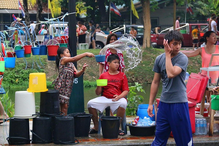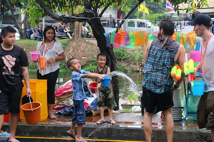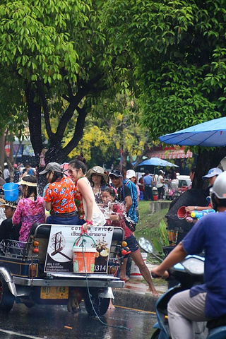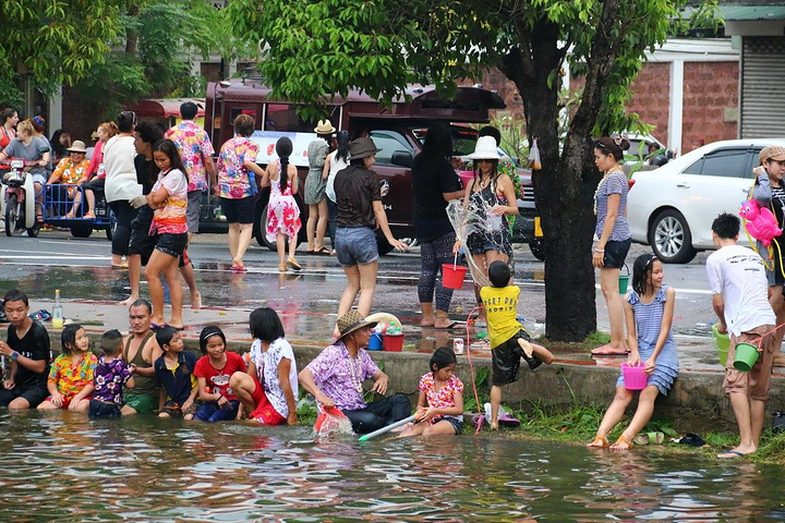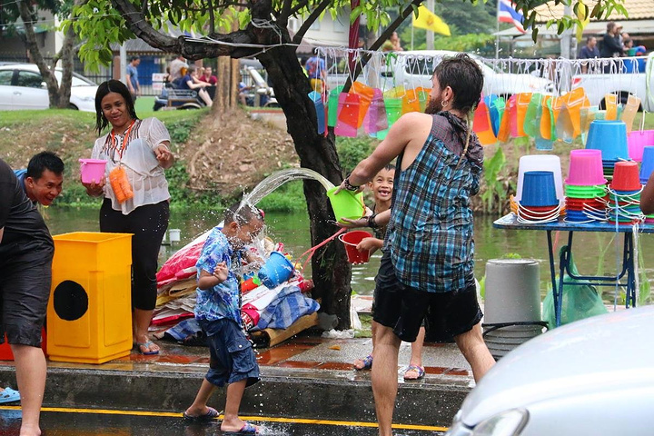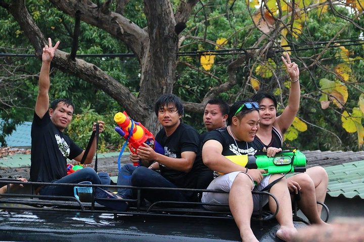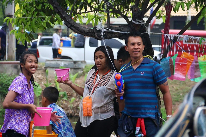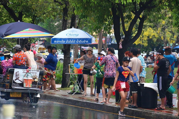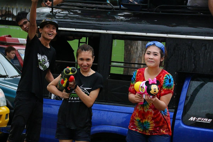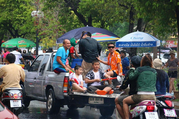 泰国很多家庭都喜欢皮卡,过节一家大小都会坐在车尾巡游,准备好一大桶水,随时“还击”
