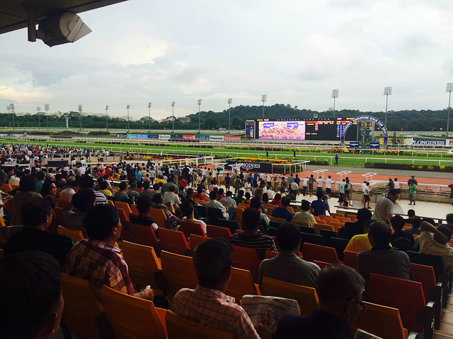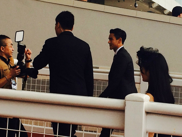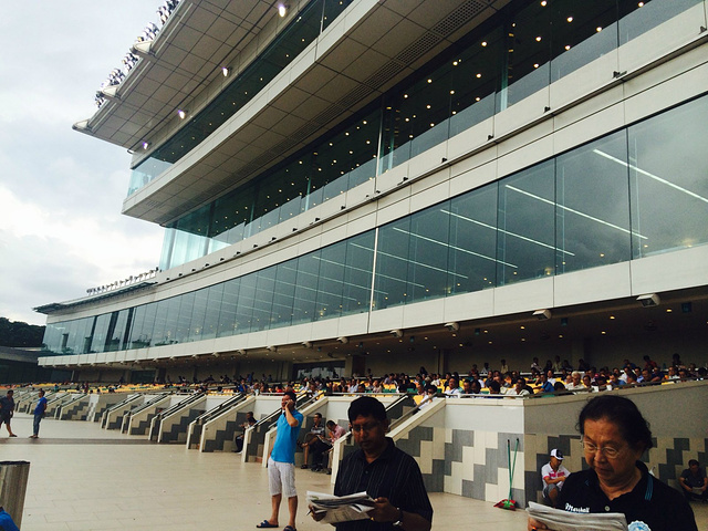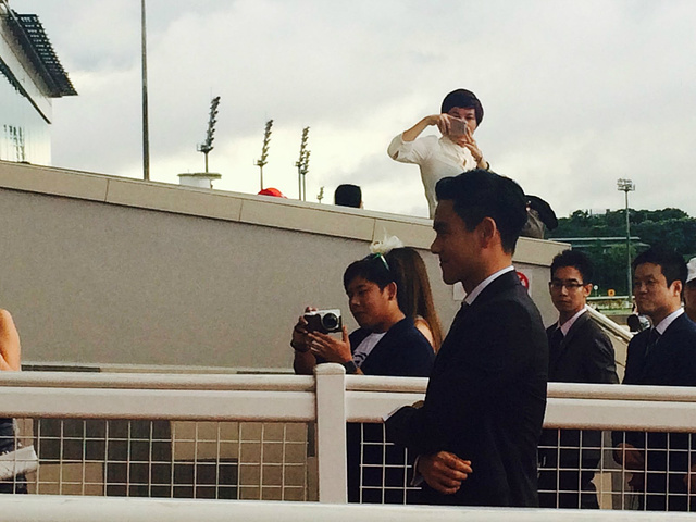3点半我们顺利到达赛马场公会,转了一圈买了门票进去了,7元新币一个人。可以说是托彭于晏的福,让我们看到了一场精彩的赛马比赛,已经在国内也没有这样的机会参加,非常的激烈的场面,我们也跟着呐喊自己中意的号数,当然我们见到了彭于晏,他本人也是真心的帅气,更是让我们两个欲罢不能
