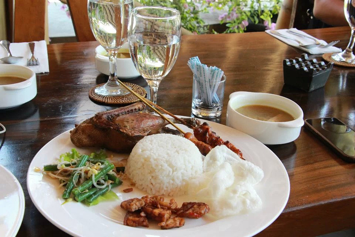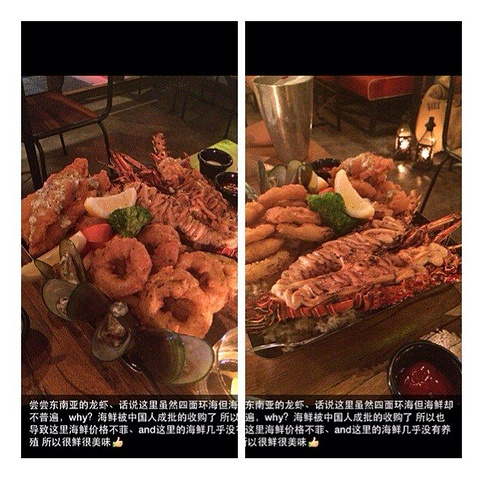 金巴兰BBQ出了点小插曲,我们分成了两批,我和老公是第二天去,于是我们这一半人直接回了酒店。我和老公正好出去自己寻找点想吃的。大家一定不要吃路边摊。我们是没吃,因为没敢。在洋人街很热闹,吃饭和演艺、spa的店太多了,住在洋人街太棒了真的!如果再去的话我希望每天都在这里住,后面两天住的villa真的挺闹心!沿着洋人街走,不建议大家走太远了,找吃饭的地儿也不用非得找人多的店,因为老公特别想尝尝这东南亚的海鲜于是我俩专门找海鲜,找的这家做得很好吃!!而且人很少,很清静,对面那家全是人挺热闹的,看大家想体验什么样的感觉吧,因为这里的人节奏很慢,一切都很慢!!所以人少的话还是有好处的:效率明显提高了。海鲜我们首选龙虾,之前在三亚第一市场买的龙虾是一百块一只挺大个的,加工费五六十左右。这里就是一大份,里面什么都有:龙虾、薯条、鱿鱼圈、贝类、炒饭,还有个吃不出来什么东西貌似是鱼,味道很赞!价格的话,这一份好像是三百人民币左右,真的太便宜了,估计在国内非沿海城市一只这么大的龙虾就要三四百。饮料这里有续杯,所以吃下来还是很实惠,算上服务费、政府税和饮品之类的我记得是四五百吧!