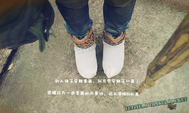 亲们,切记哦登山不要穿雪地靴,如果遇见山路湿滑不好走路,就教你一招把袜子脱下来穿在鞋子外面可以增加摩擦力,不会这么容易滑倒哦,但最重要的还是穿着要方便.
