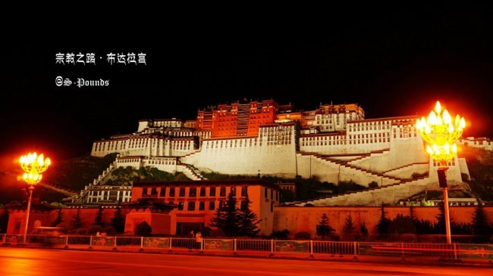 布达拉宫的灯饰工程不惜血本,白色灯光打得宫墙熠熠生辉,如同金色宫殿,雄踞上头,十分宏伟。布达拉宫广场旁边有几个人工湖,想拍倒影,但效果很不好,明天再来看看。