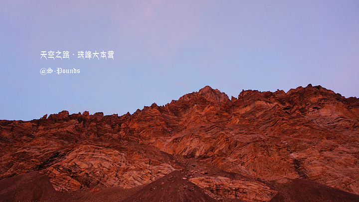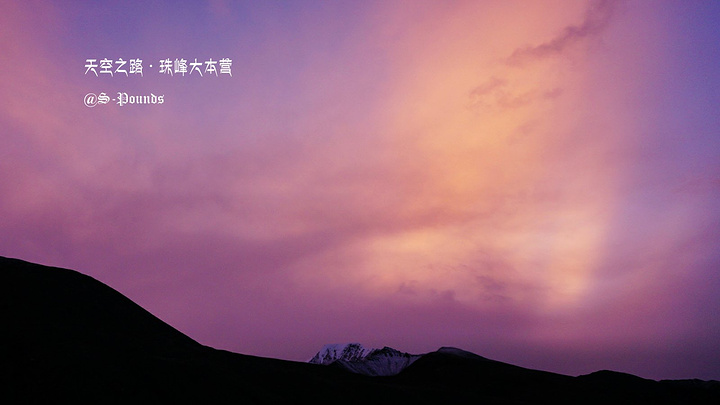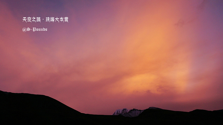 吃完面,没事做,我时不时地拉开帐篷门帘,探出头去看看外面的天气。虽然大雾弥漫,不像要放晴的样子,但高原天气多变,谁又说得准呢。终于,我的探测得到了回报。虽然大雾并未散去,珠峰还是看不到,但一时间,晚霞透了出来,把整个天空、山体都映出粉红色、浅紫色和金黄色。