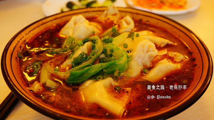 很快,抄手煮好端上来了,个头硕大的抄手,皮薄肉多,面汤浮着一层红油,香气四溢,还有几根青翠的蔬菜。
