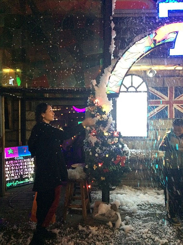 当天圣诞节,有个酒吧外面用喷雪制造的下雪的画面,对于南方的孩子,看见这模拟的雪也很激动开心啊~~~~