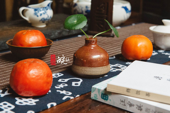 厅堂的茶几上,三只红色的柿子显得特别养眼