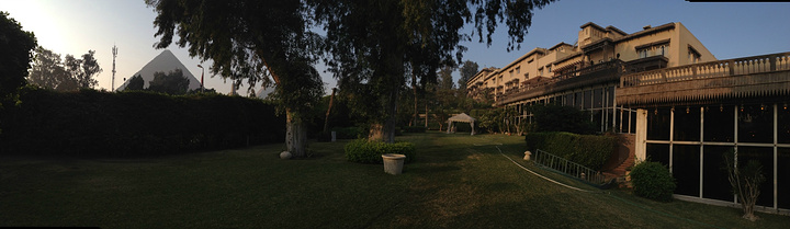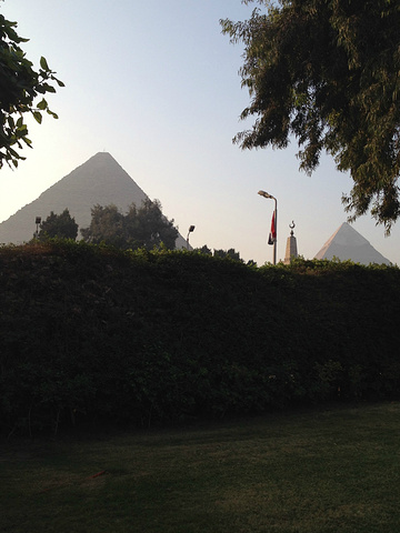 酒店自助餐厅外的草地上拍摄的胡夫金字塔(左)和哈夫拉金字塔(右)。