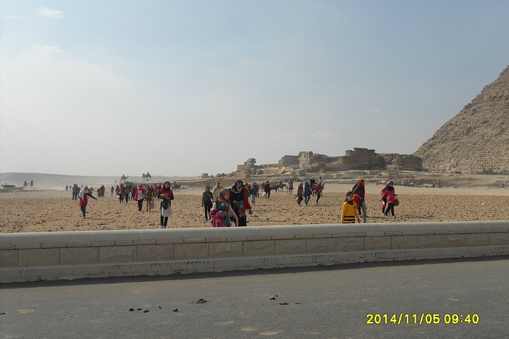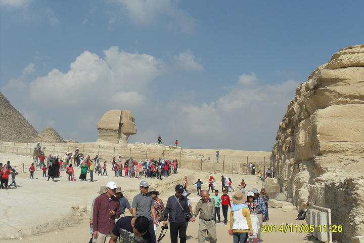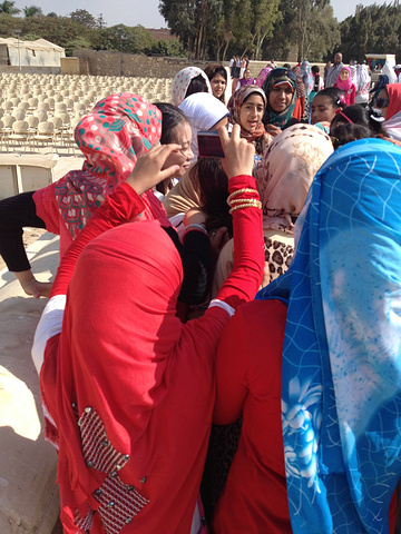 在狮身人面像前,团友被要求合影的阿拉伯女学生团团围住。阿拉伯女学生过来时,会‘Hello’打招呼要求合影。表示同意后,她们叽叽喳喳,异常兴奋地围了上来。后在貌似她们老师的劝说下,才不舍地离去。她们更愿与女生合影。阿拉伯小伙子也会比划与我们合影。