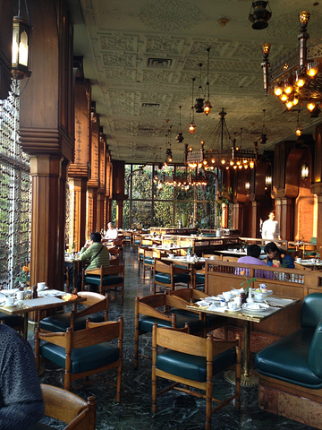 在酒店自助餐厅内拍摄的胡夫金字塔。