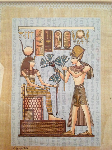 纸莎草画的纸张是由纸莎草制作的,被称为莎草纸。纸莎草其实是一种芦苇的分支,茎很粗,成三棱形。古埃及人很早就学会了用纸莎草做纸。这种纸比中国发明的造纸术还要早许多年。成功仿制纸草纸的,是一个名叫哈桑•拉杰布的埃及人。他曾是埃及驻中国的第一任大使。拉杰布从小就对古埃及文化感兴趣。1968年退休后,他潜心研究莎草纸制造技术,终于如愿以偿地找到了古人的方法,使古埃及这一文化精粹得以重见天日。在店里买了一幅序号347标价550埃镑的纸莎草画,成交价55美元。最后支付50美元+35埃镑。