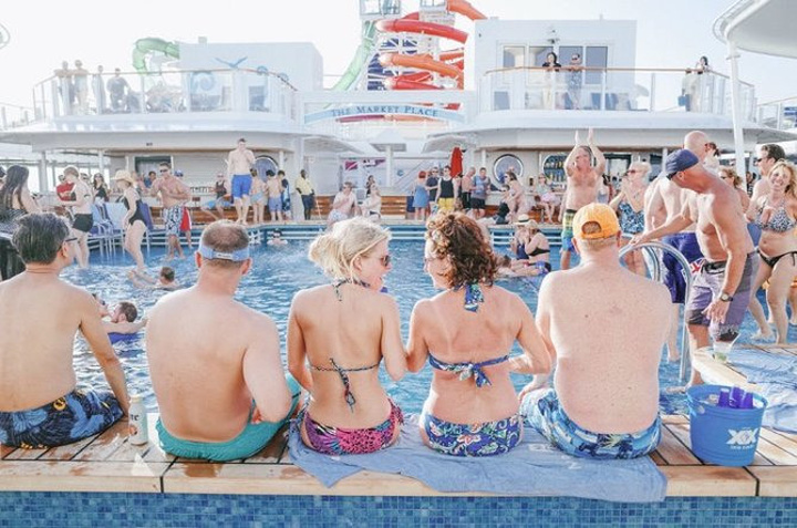 图片左右下角可以看到HOT TUB,可以泡泡澡,上面有按摩按钮,会定时按摩。平时的人很多,六七点的时候人不多,可以来安静享用。中间的走廊是卖一些游泳的东西的,最后会搞大甩卖。BAR台可以用房卡直接买饮料。